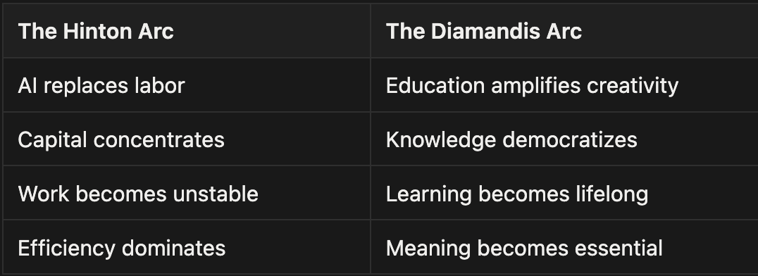 When we fuse Hinton and Diamandis, the future unfolds in two parallel arcs — one economic, one human: